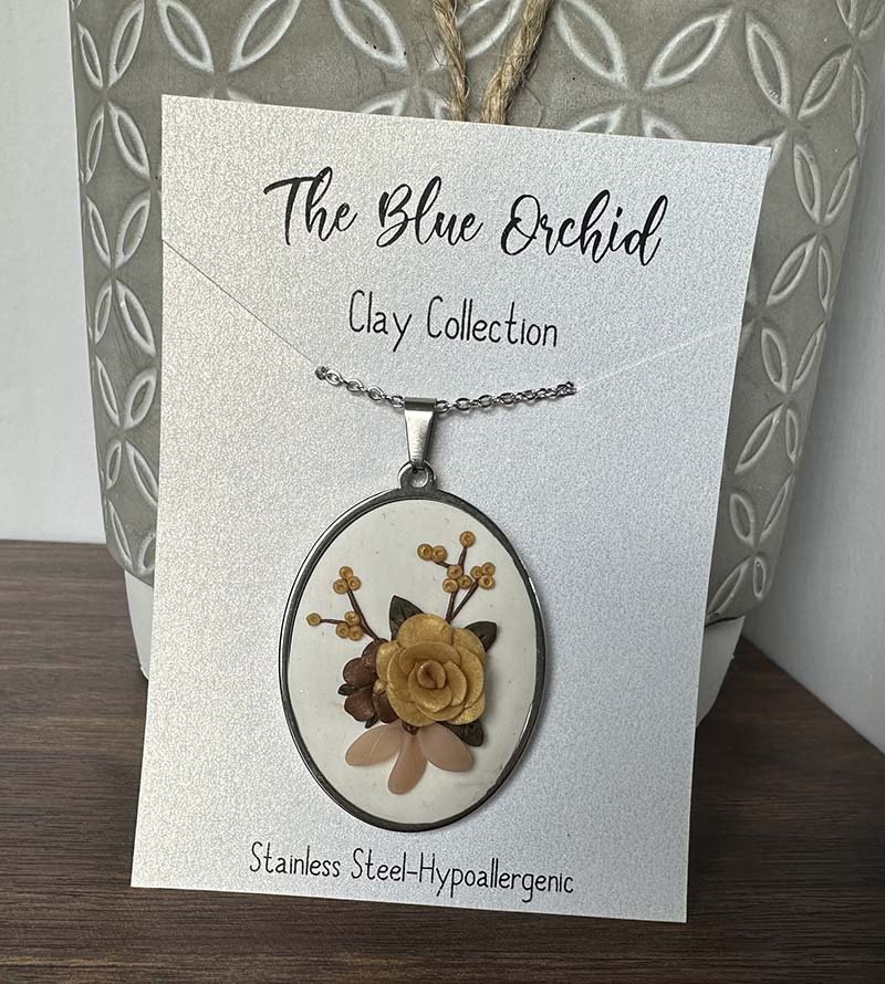 These are our handmade clay collection neclaces. Each one is skillflully crafted by hand using thermo-set clay. The handmade nature of these pieces means each one is completely unique. Earrings are also available with similar floral styles.