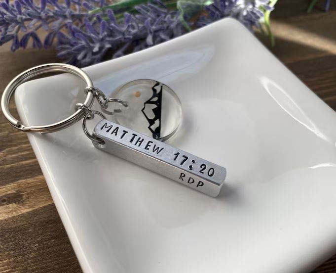 These are our personalized Mustard Seed of Faith keychains. This is the perfect gift for any occasion. The bar is made of aluminum which makes it lightweight and is hand-stamped on two sides. One side is stamped with the Bible verse, Matthew 17:20 (KJV).